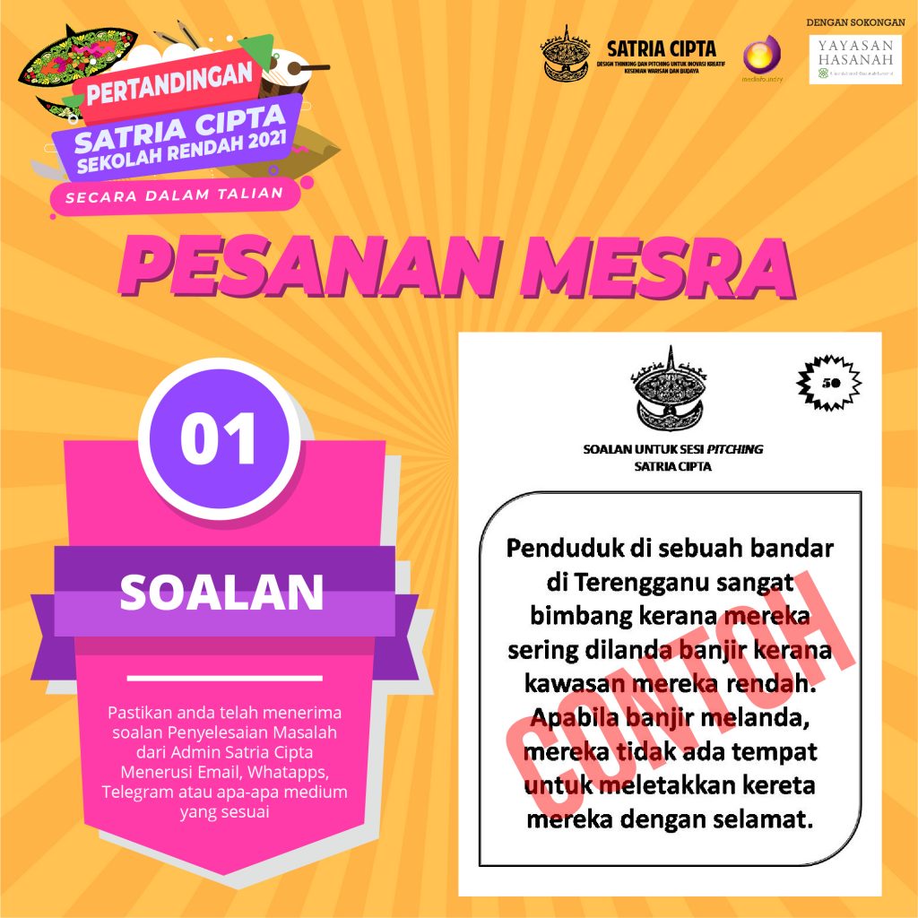 1. Pastikan guru-guru mendapat Soalan/Problem Statement. Soalan telah dihantar menerusi Email yang guru isi sewaktu membuat pendaftaran. Jika menghadapi masalah terus hubungi Admin Satria Cipta : www.wasap.my/601159870971/PertandinganSatriaCipta