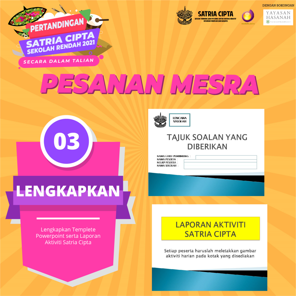 3. Para peserta mestilah lengkapkan dan hantar semula template Powerpoint kepada Pihak Satria Cipta. Jangan lupa masukkan gambar aktiviti harian Satria Cipta pada ruangan yang disediakan